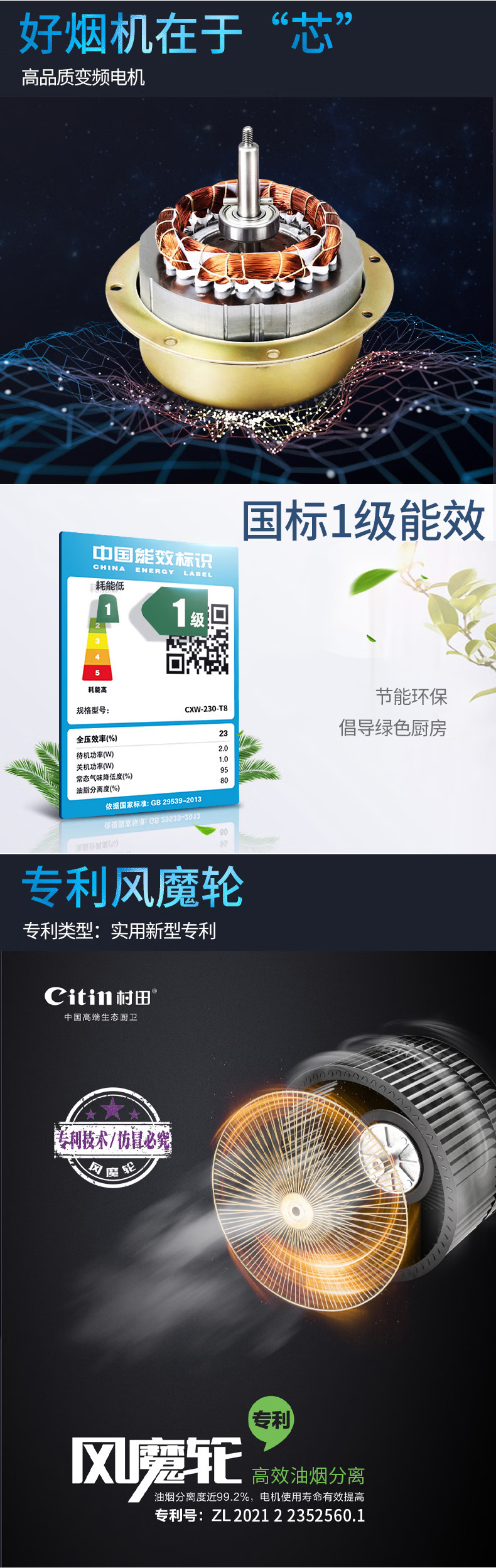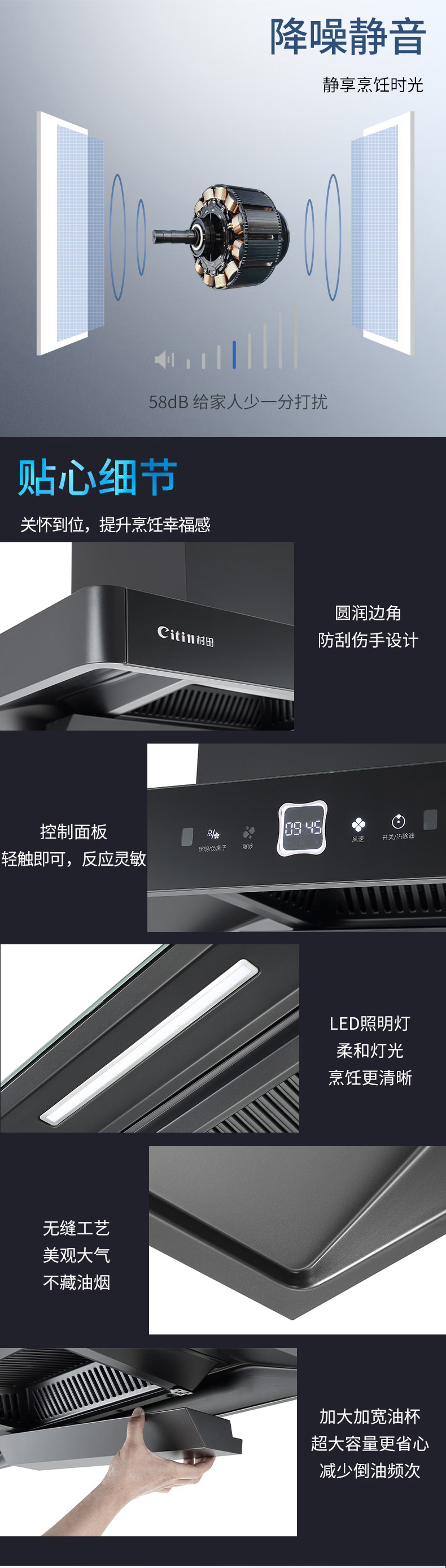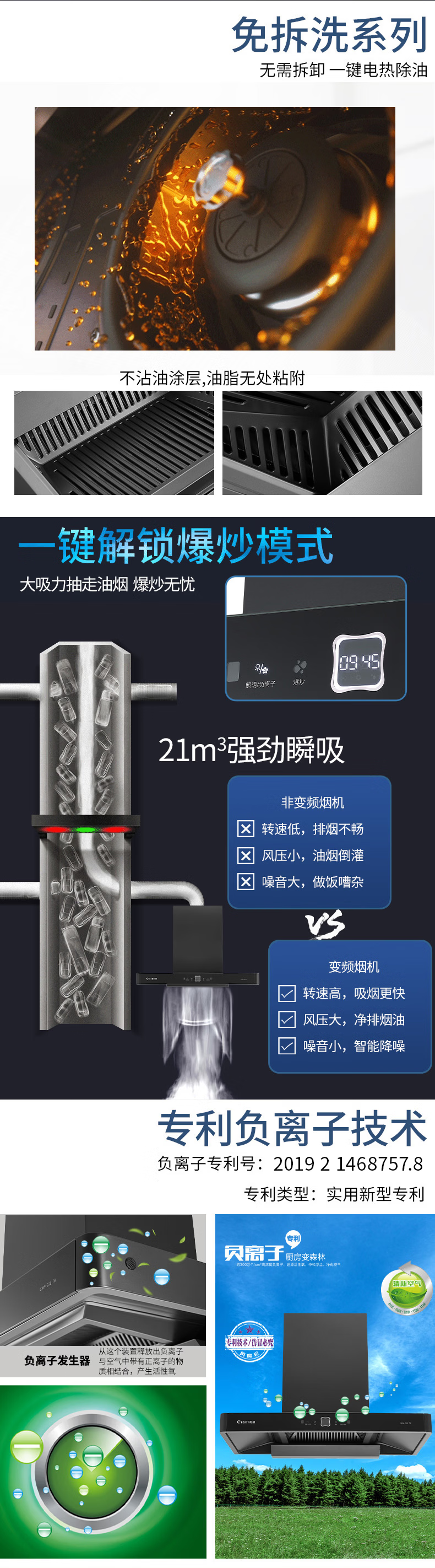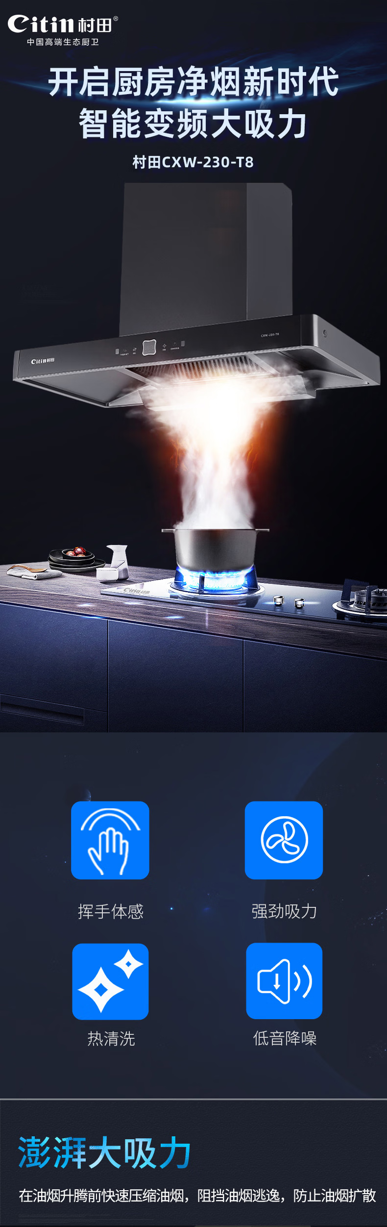 ◈挥手体感 ◈灰黑外观 ◈变频静压 ◈无极调速 ◈降噪静音 ◈一键爆炒 ◈无缝工艺 ◈澎湃大吸力 ◈专利负离子 ◈专利风魔轮