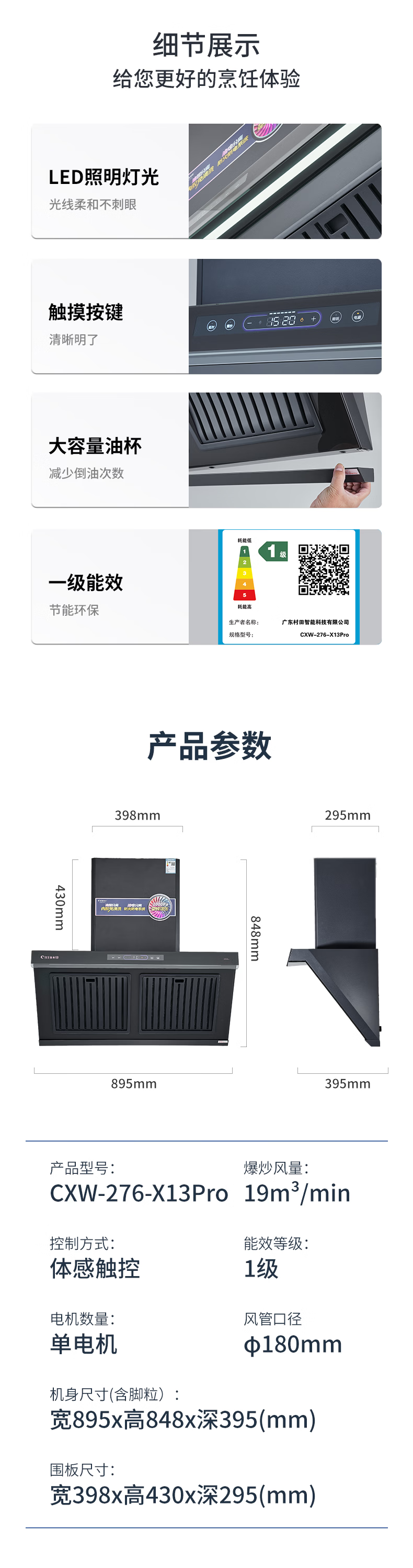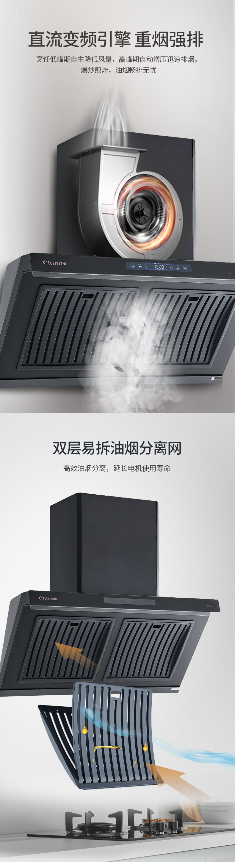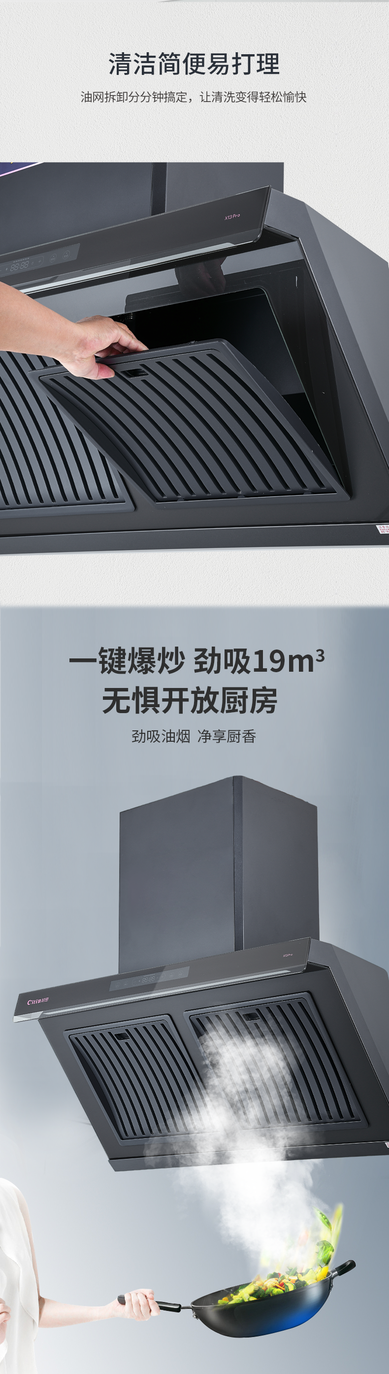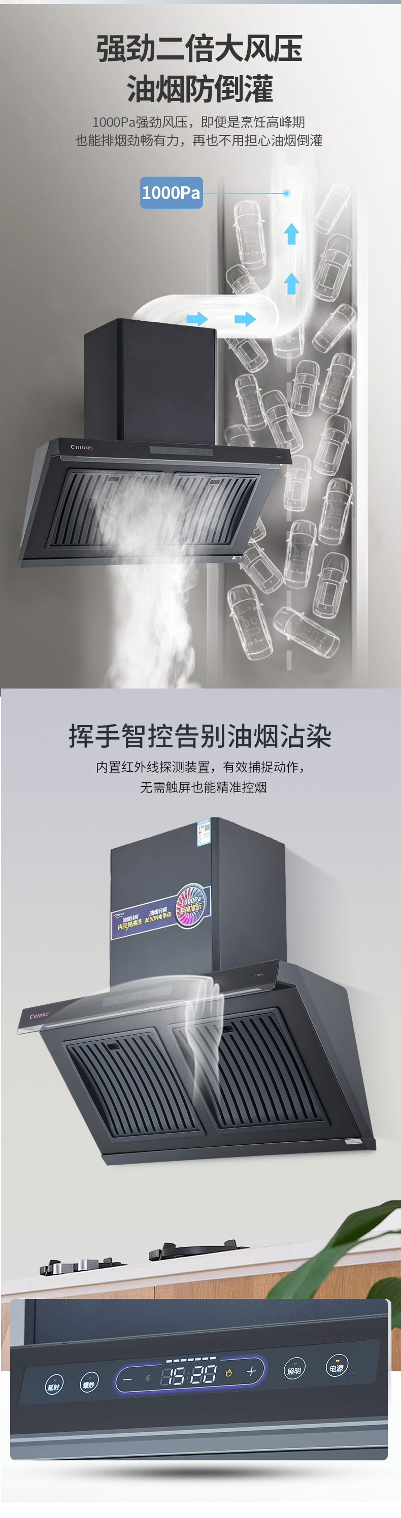 +6键触控 +体感 +上置电机 +直流变频 +千帕风压 +油电分离 +油烟分离网 +时尚LED照明灯