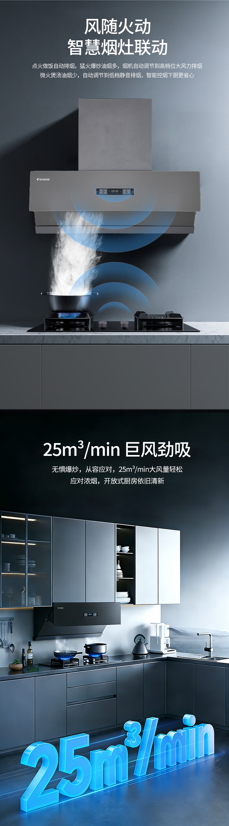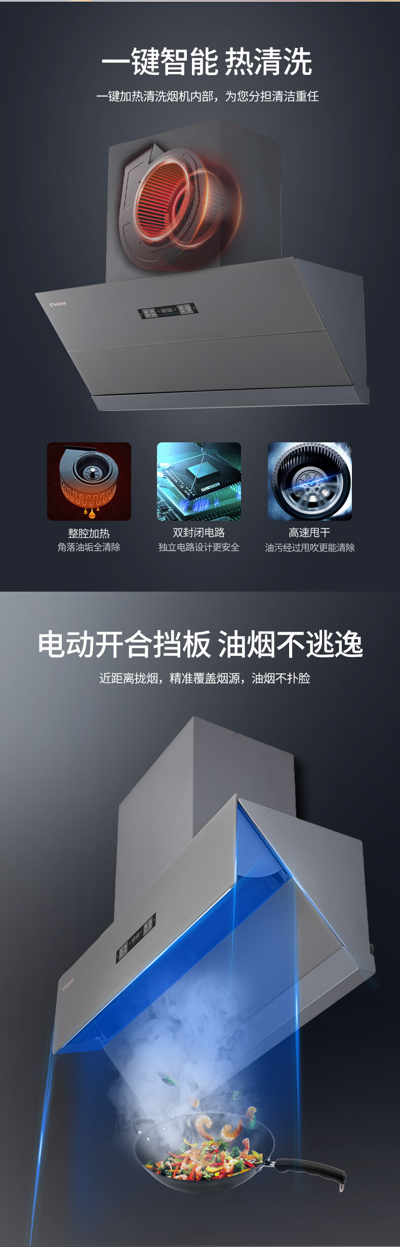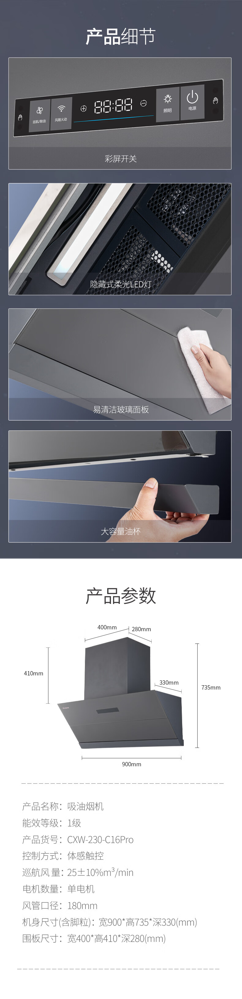 +6键超薄彩屏开关 +云米灰箱体 +全黑钢化玻璃 +风随火动 +直流变频 +可拆油网 +电动开合挡板 +热清洗 +千帕风压