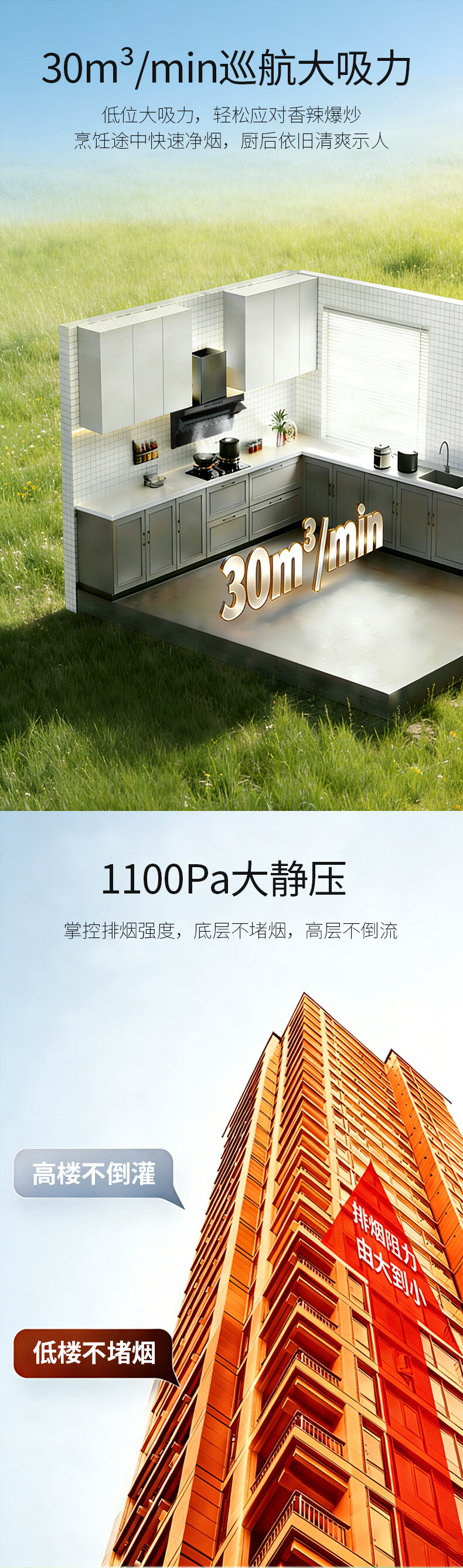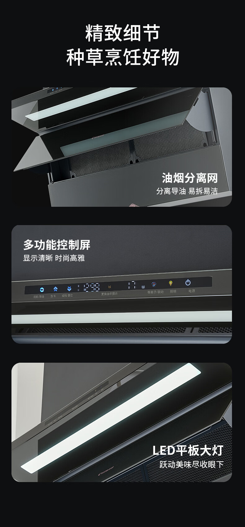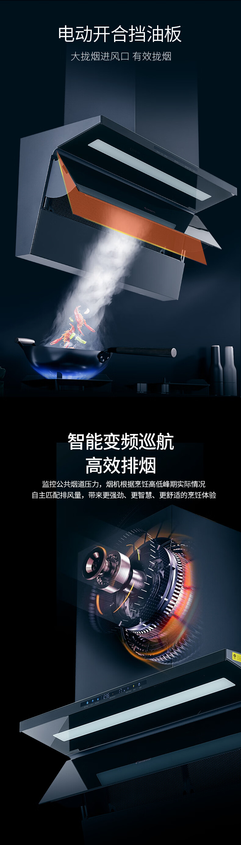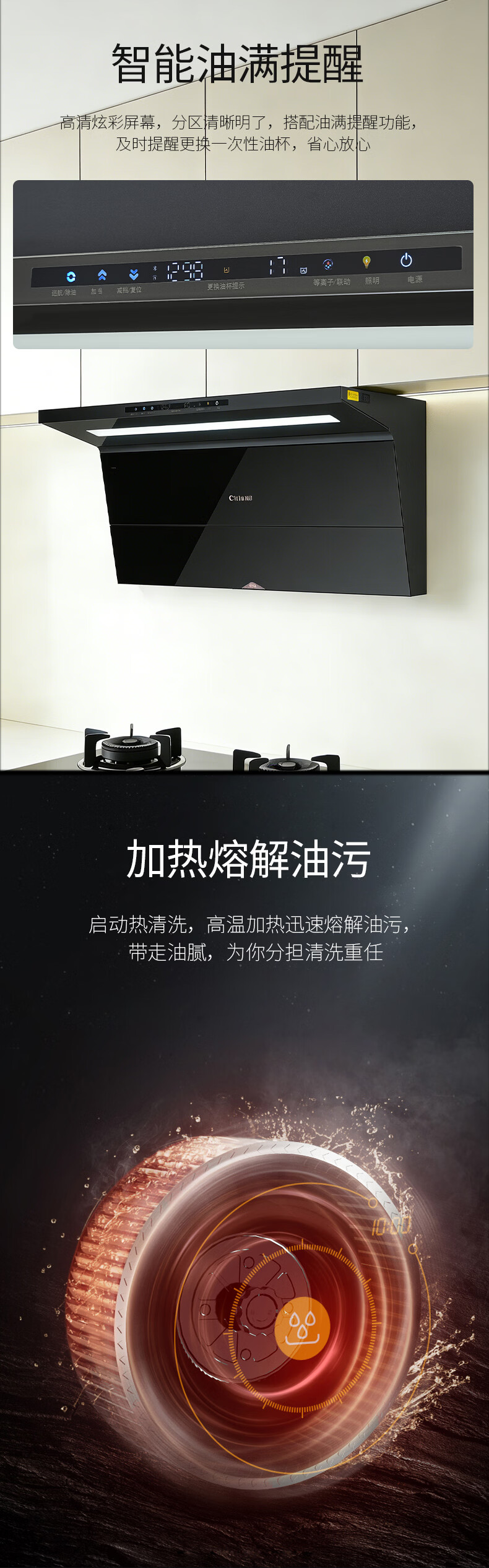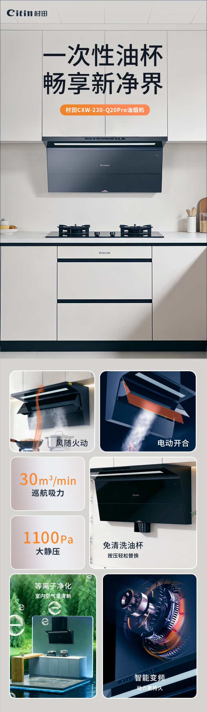 +一键爆炒 +1200Pa直流变频 +30立方大吸力 +顶侧双吸 +负离子 +一次性免洗油杯 +烟灶联动 +自清洁 +挥手感应