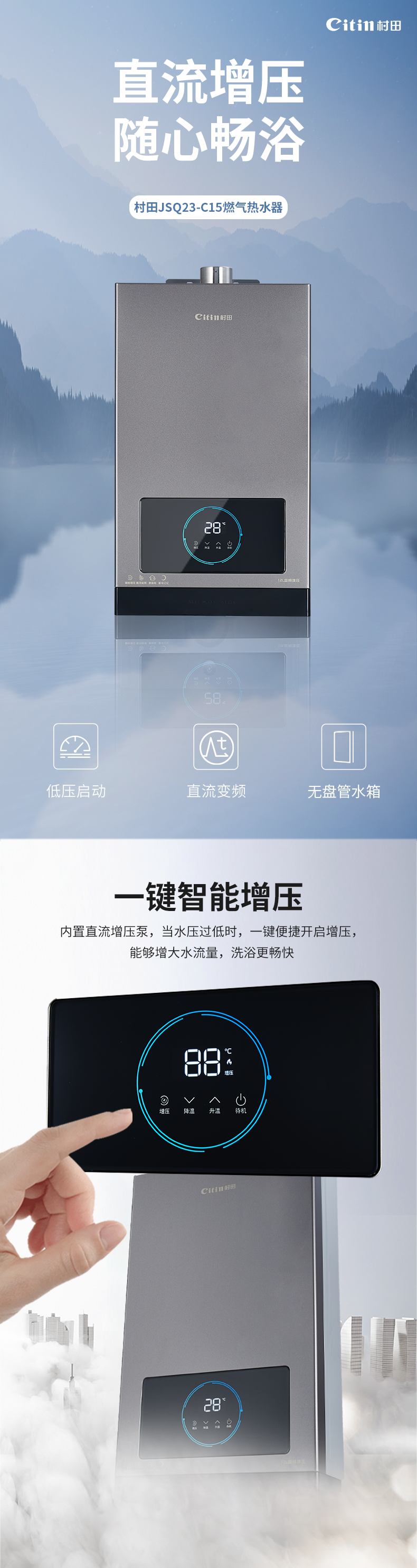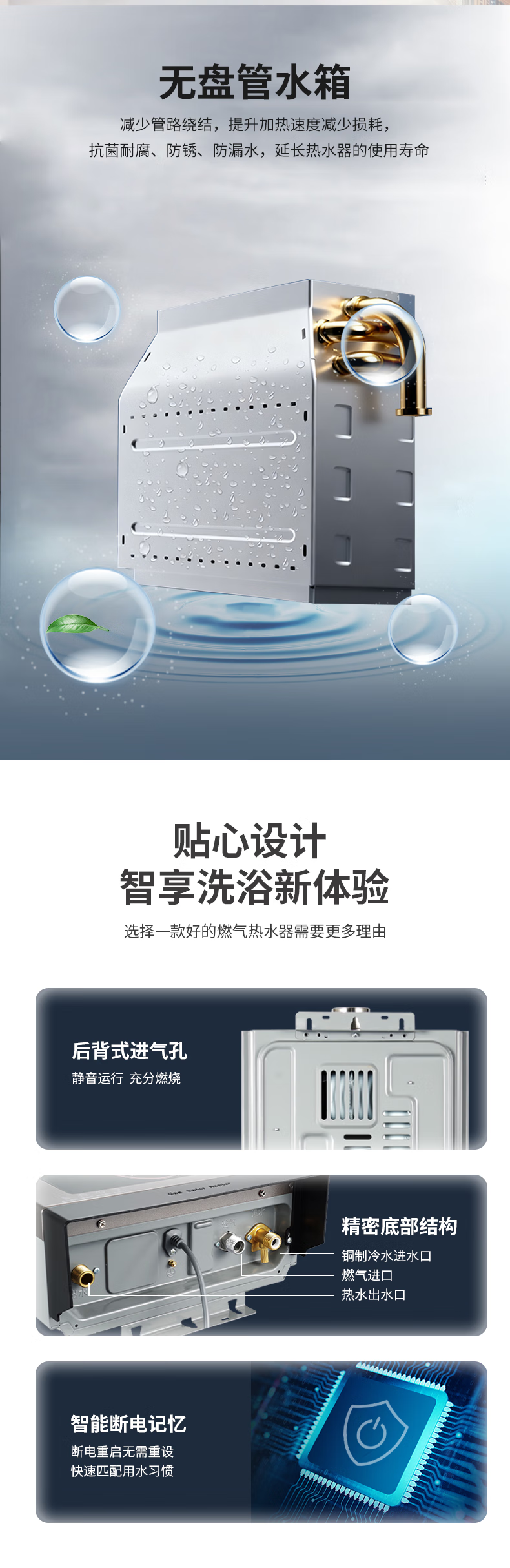 +4键触控 +直流变频 +无盘管 +智能变升 +静音舱 +智能增压 +断电记忆 +强排式 +节能省气 +磁化净水 +大出水量