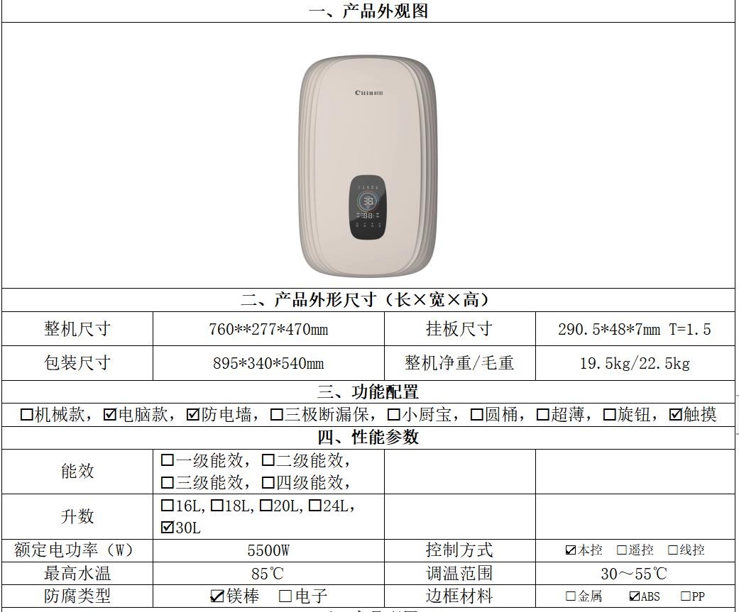升数 30L额定功率 5500W/5500W保护方式 多重漏电保护产品尺寸 760x470x277mm