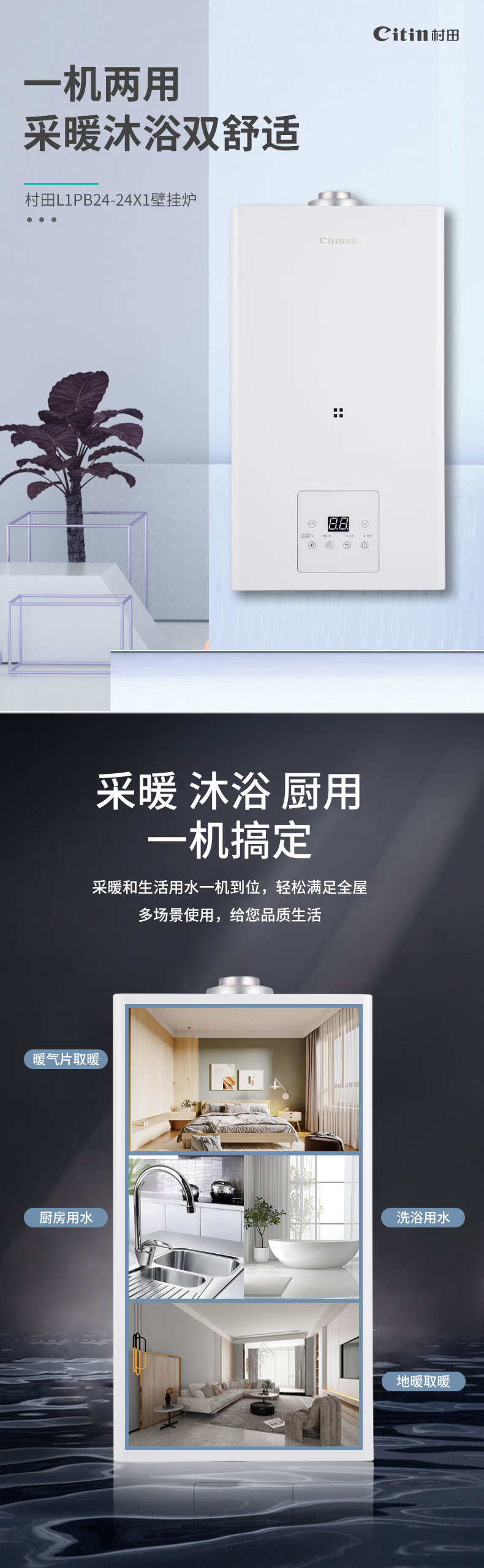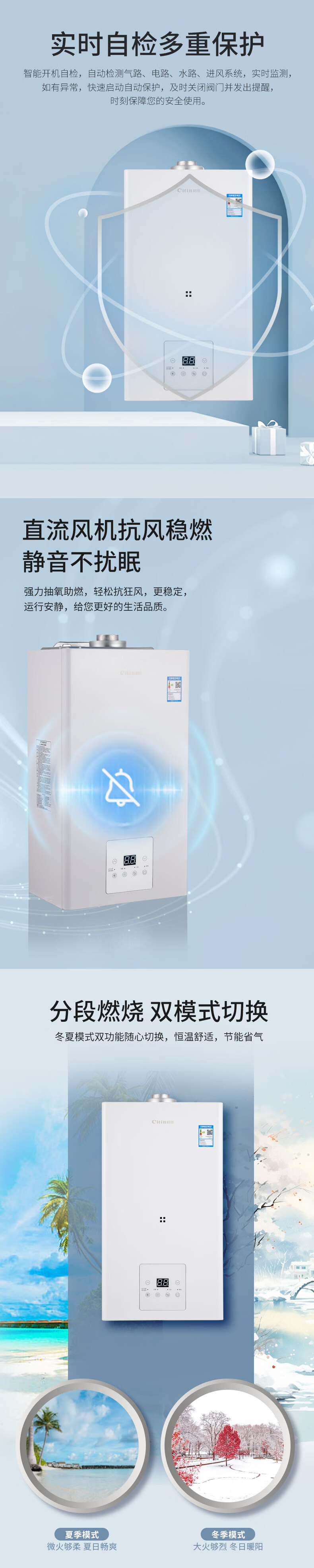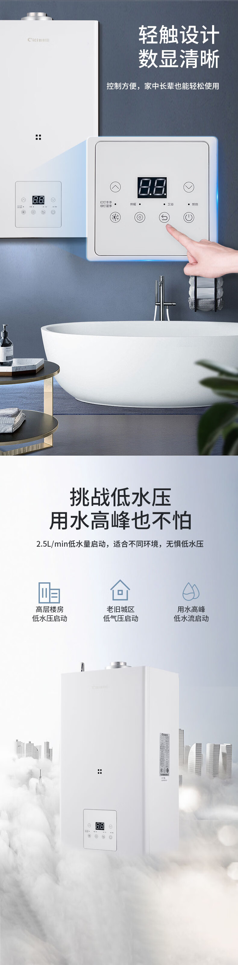 +全触摸屏 +白色面板 +直流风机 +实时自检 +板式换热 +一机多用 +防冻技术 +洗漱沐浴 +地暖供暖
